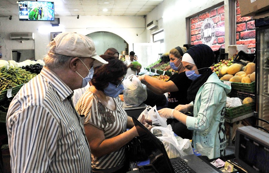 Syrians do shopping at a grocery store in Damascus, capital of Syria, on Jun. 25, 2020. The U.S. has imposed sanctions on Syria under the so-called Caesar Act, which was strongly condemned by Syria as targeting the livelihood of the Syrian people and their well-being. (Photo/Xinhua)
