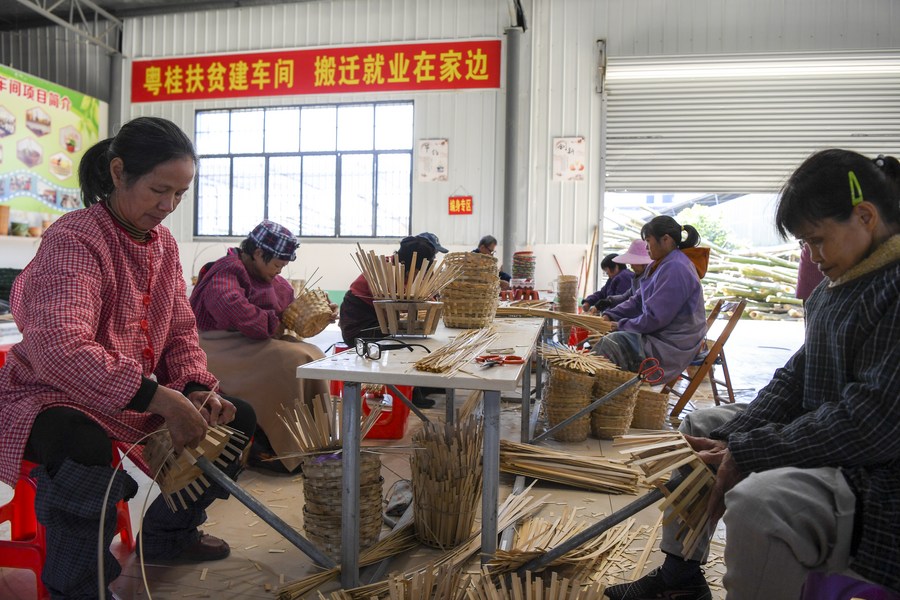 Workers make bamboo baskets at a “pairing assistance” workshop in Xincheng County, south China’s Guangxi Zhuang Autonomous Region, Dec. 8, 2021. (Photo/Xinhua)