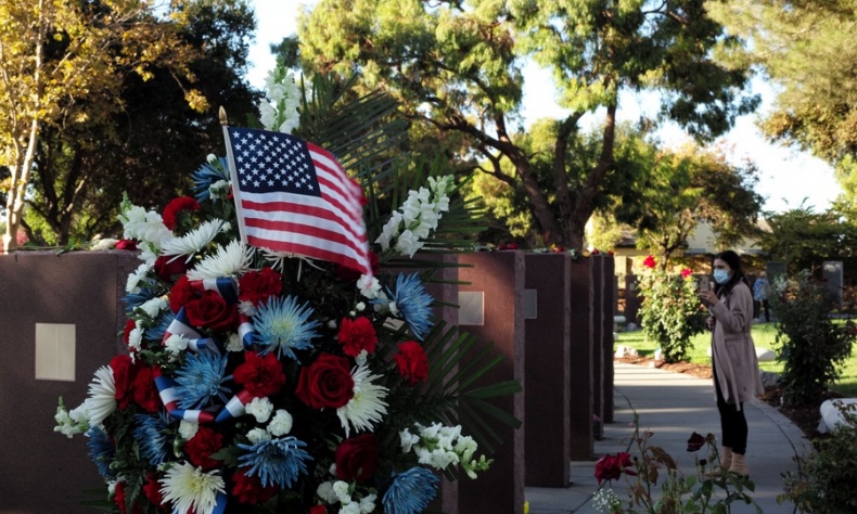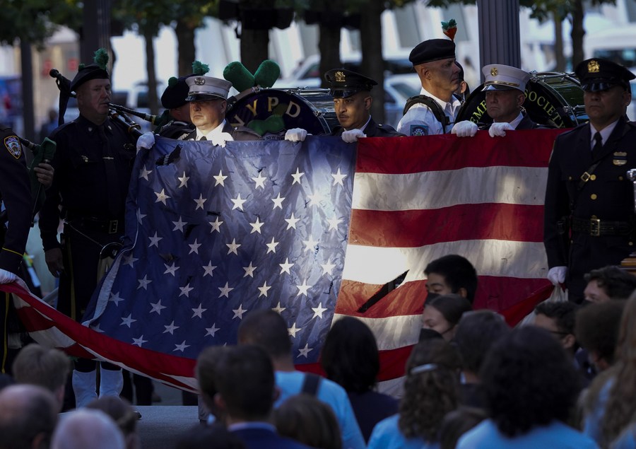 A U.S. national flag is shown by a guard of honor during a commemoration ceremony of the 20th anniversary of the 9/11 attacks in New York, the United States, on Sept. 11, 2021. (Photo/Xinhua)