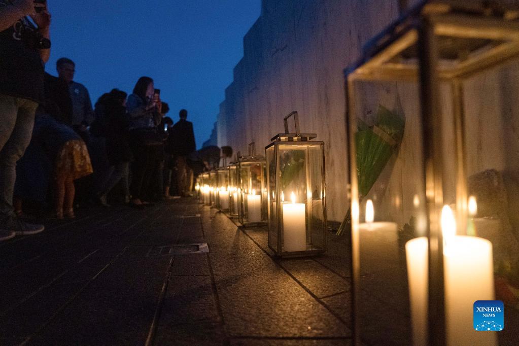 People visit the Wall of Names during a candlelight memorial to the passengers and crew of United Airlines Flight 93 in Shanksville, Pennsylvania, the United States, Sept. 10, 2021. Memorials were held at the Flight 93 National Memorial in Pennsylvania to mark the 20th anniversary of the Sept. 11 attacks. (Photo/Xinhua)