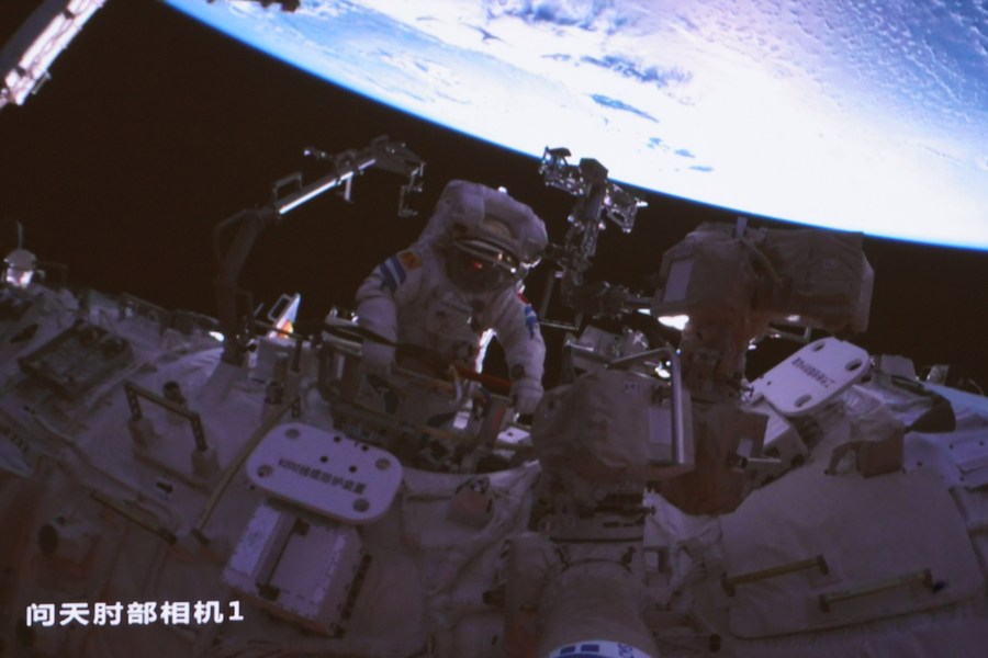 This screen image captured at Beijing Aerospace Control Center on Nov. 17, 2022 shows China’s Shenzhou-14 taikonaut Chen Dong having exited the space station lab module Wentian. (Photo/Xinhua)