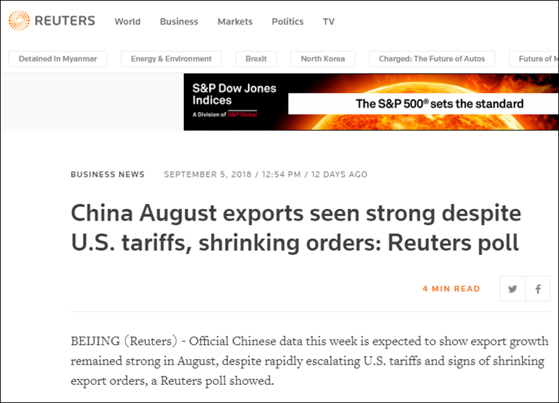 ▲ China has been doing well by the way. The latest data released by China’s statistical bureau on September 14, showed that China’s economy is in pretty good shape as reported by Reuters. China’s exports to the U.S. have held up so far despite Trump’s tariffs on $50 billion of Chinese goods.