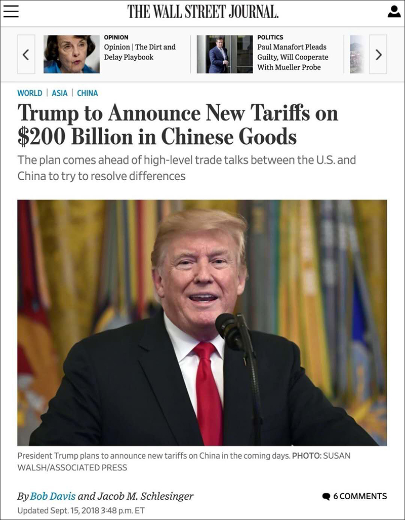 ▲ The Wall Street Journal, however, reported on September 15 that Trump is determined to go with tariffs on $200 billion worth of Chinese products. Earlier, there were also reports of Trump instructing the USTR to proceed with the tariffs.