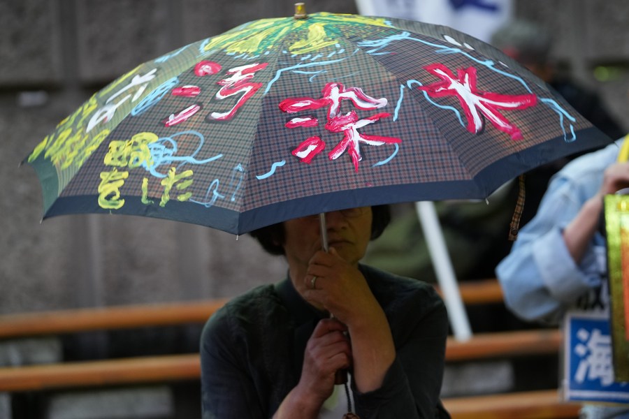 A woman protests against the Japanese government’s plan to discharge nuclear-contaminated water into the sea at Hibiya Open-Air Concert Hall in Tokyo, Japan, May 16, 2023. (Photo/Xinhua)