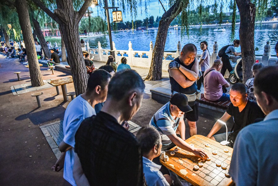 People play Xiangqi, or Chinese chess, by Shichahai Lake in central Beijing, capital of China, Jun. 10, 2023. (Photo/Xinhua)