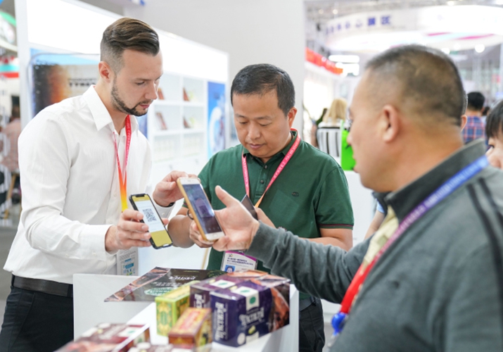 A visitor pays via Wechat at the China-Russia Expo in Harbin, Heilongjiang Province in northeast China on June 15, 2019. (Photo/Xinhua)