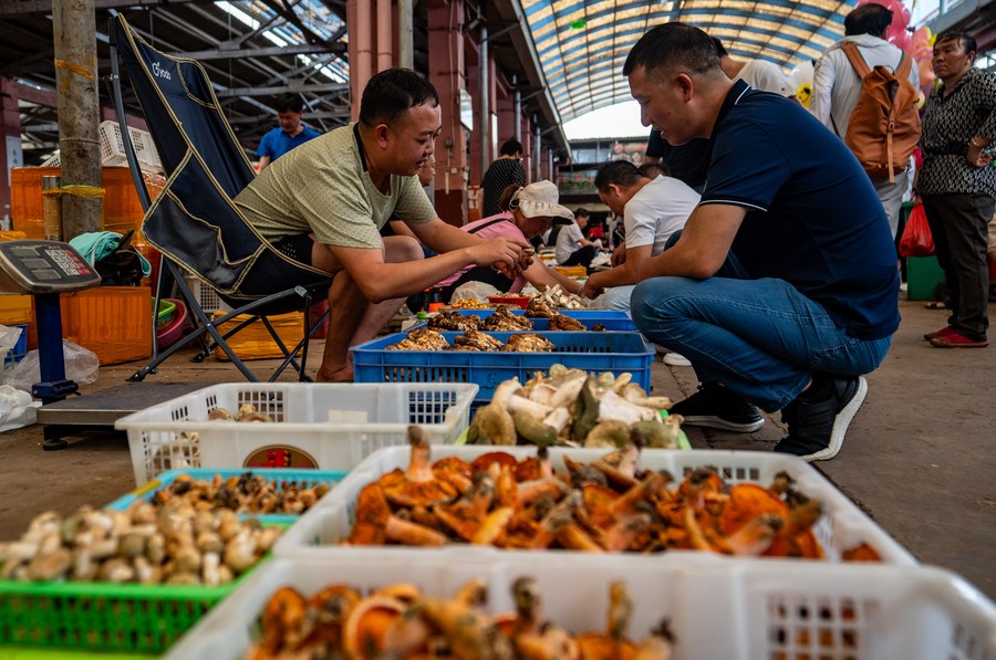 A vendor sells edible wild mushrooms to a customer at a wild mushroom trade market in Kunming, southwest China’s Yunnan Province, Jul. 2, 2023. (Photo/Xinhua)