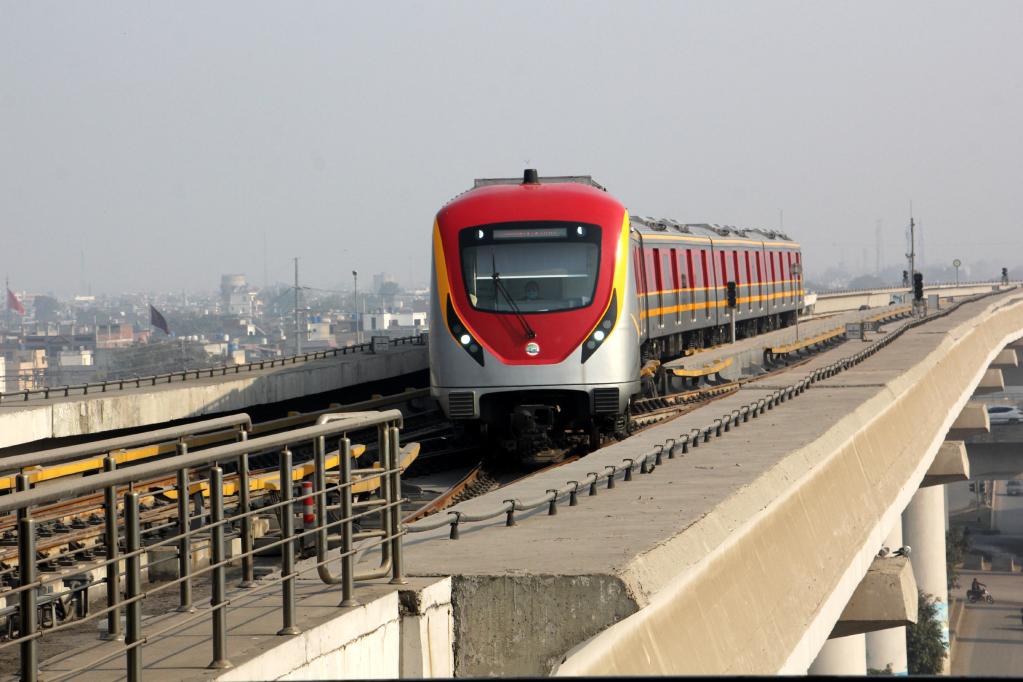 An Orange Line metro train pulls into the terminal station in Lahore, Pakistan, Dec. 29, 2021. (Photo/Xinhua)