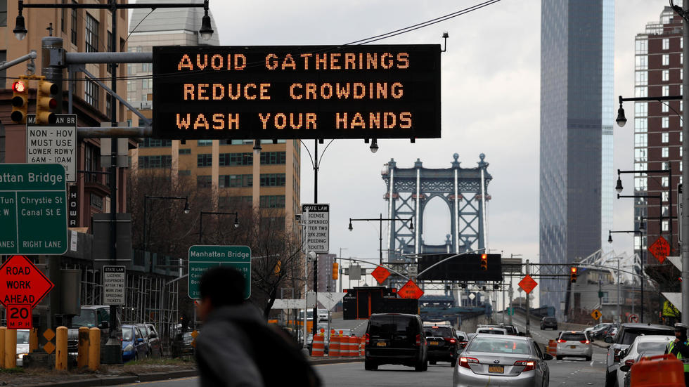 Precautions about the coronavirus displayed at the entrance to the Manhattan Bridge in the Brooklyn borough of New York City, US, 20 March 2020.