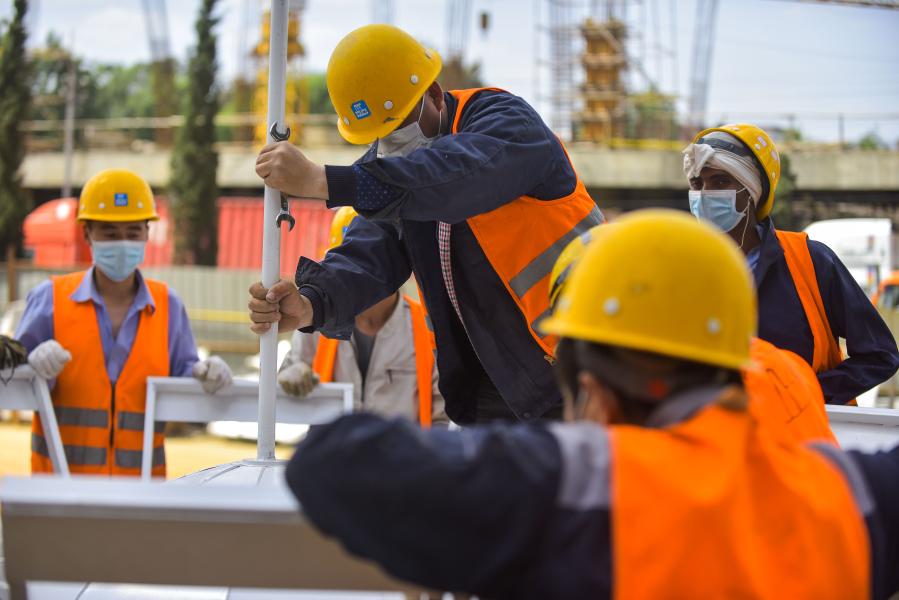Chinese and Ethiopian construction workers work at the construction site of the future headquarters of the Commercial Bank of Ethiopia (CBE) in Addis Ababa, Ethiopia, May 21, 2021. (Photo/Xinhua)