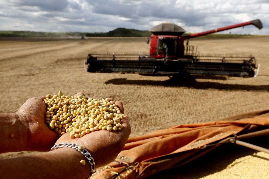 A farmer displays newly-harvested soybeans in the fields on the outskirts of Brasilia, Brazil, Feb. 4, 2021. (Photo/Xinhua)