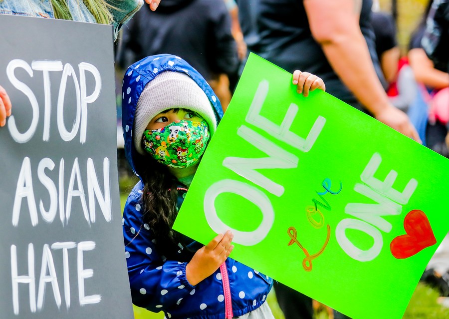 People holding signs take part in a Stop Asian Hate rally in San Jose, California, the United States, April 25, 2021. (Photo/Xinhua)