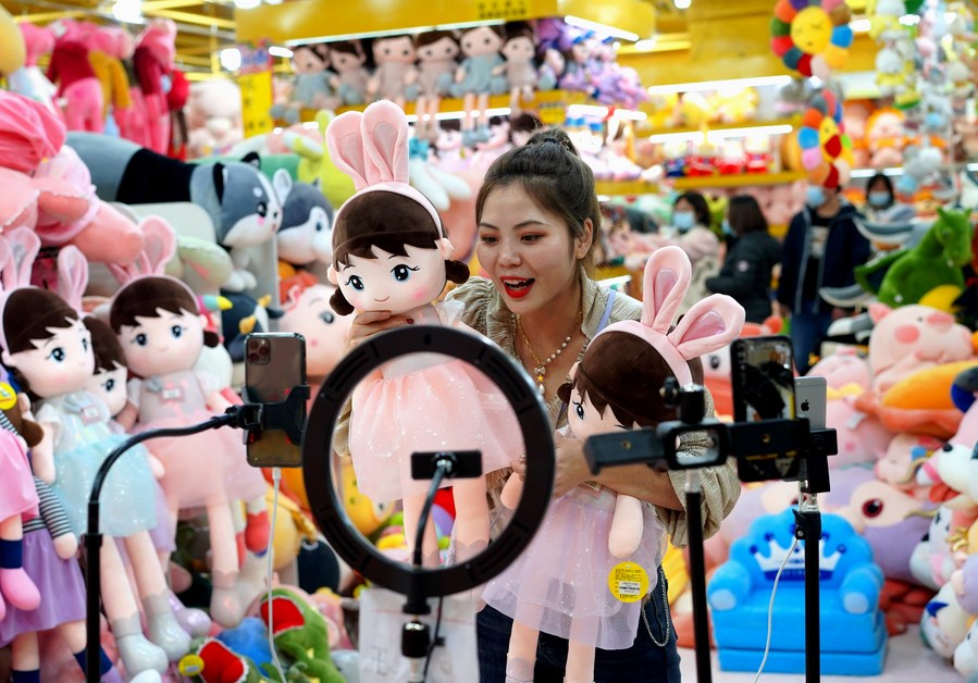 A saleswoman promotes stuffed toys via livestreaming at an international trading center in Baoding city of North China’s Hebei province, on Feb 2, 2021. (Photo/Xinhua)