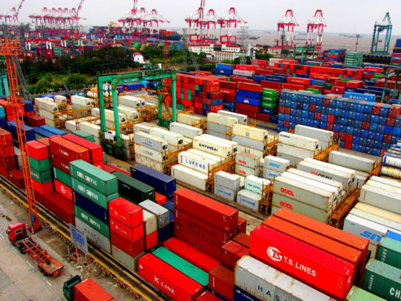 Containers are piled up at Waigaoqiao Port in the Shanghai Free Trade Zone. (Xinhua/Chen Fei)