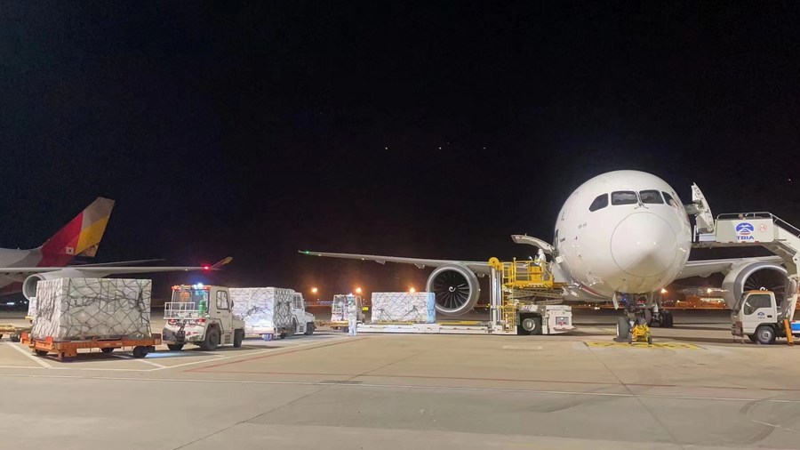 Photo taken on Nov. 25, 2021, shows the sixth batch of China-aided COVID-19 vaccines arrive in Dhaka, capital of Bangladesh. (Embassy of the People’s Republic of China in Bangladesh/Handout via Xinhua)