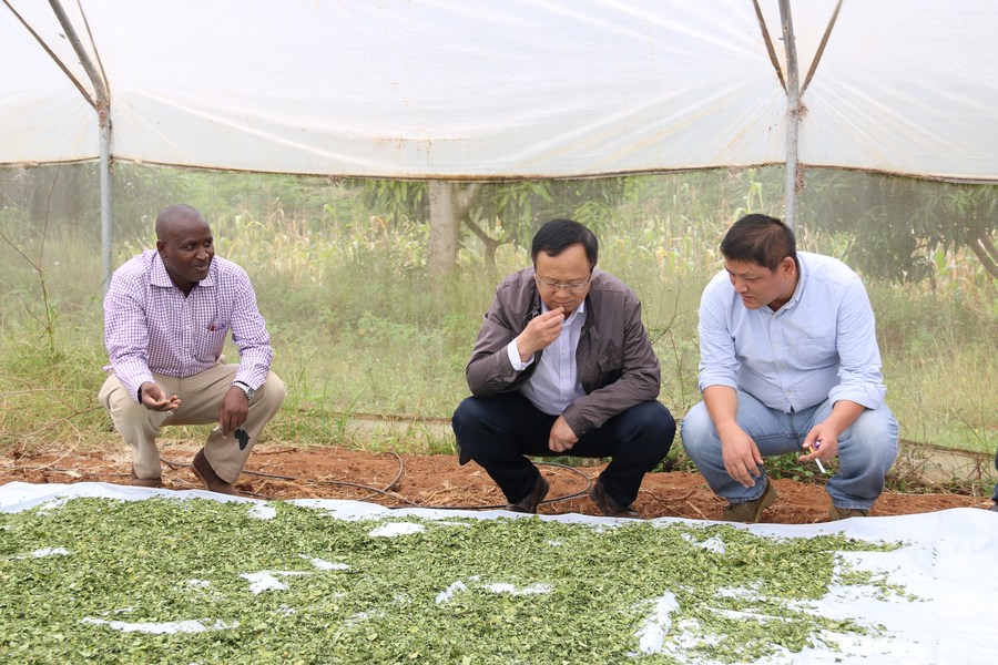 This file photo shows Wang Qingfeng (C), director of Sino-Africa Joint Research Centre that is affiliated with Chinese Academy of Sciences, was instructing the application of economic plants for local villagers in Kenya, on Jun. 19, 2018. (Photo/Xinhua)