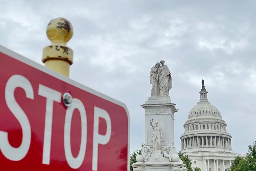 Photo taken on May 28, 2021 shows the U.S. Capitol building behind a traffic sign in Washington, D.C., the United States. (Photo/Xinhua)
