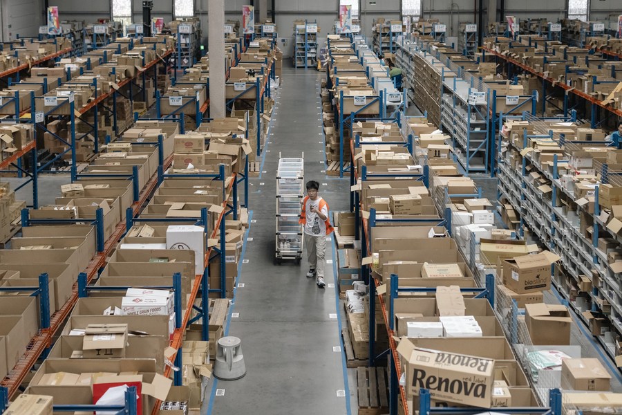 A staff member works in a Yiwu Cainiao bonded warehouse in Yiwu, east China’s Zhejiang Province, Jul. 19, 2023. (Photo/Xinhua)