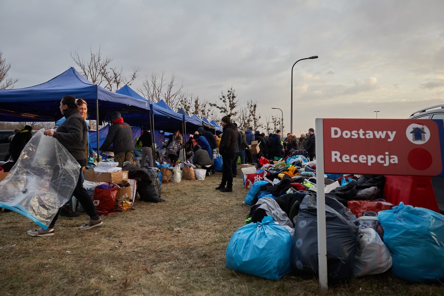 Photo taken on Feb. 26, 2022 show a temporary resettlement site for people from Ukraine, in Przemysl, Poland. (Photo/Xinhua)