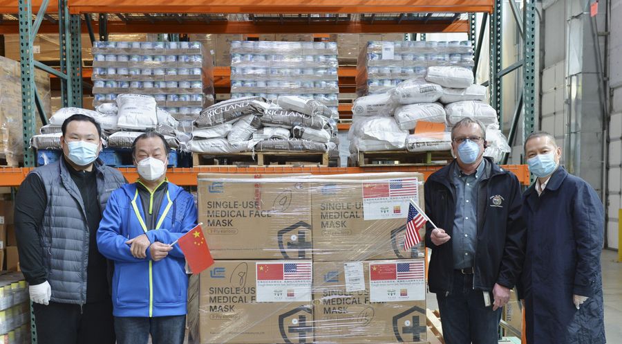 Photo taken on April 27, 2020 shows people posing for a photo with the face masks donated by China’s Fujian Province in Oregon, the United States. (Photo/Xinhua)