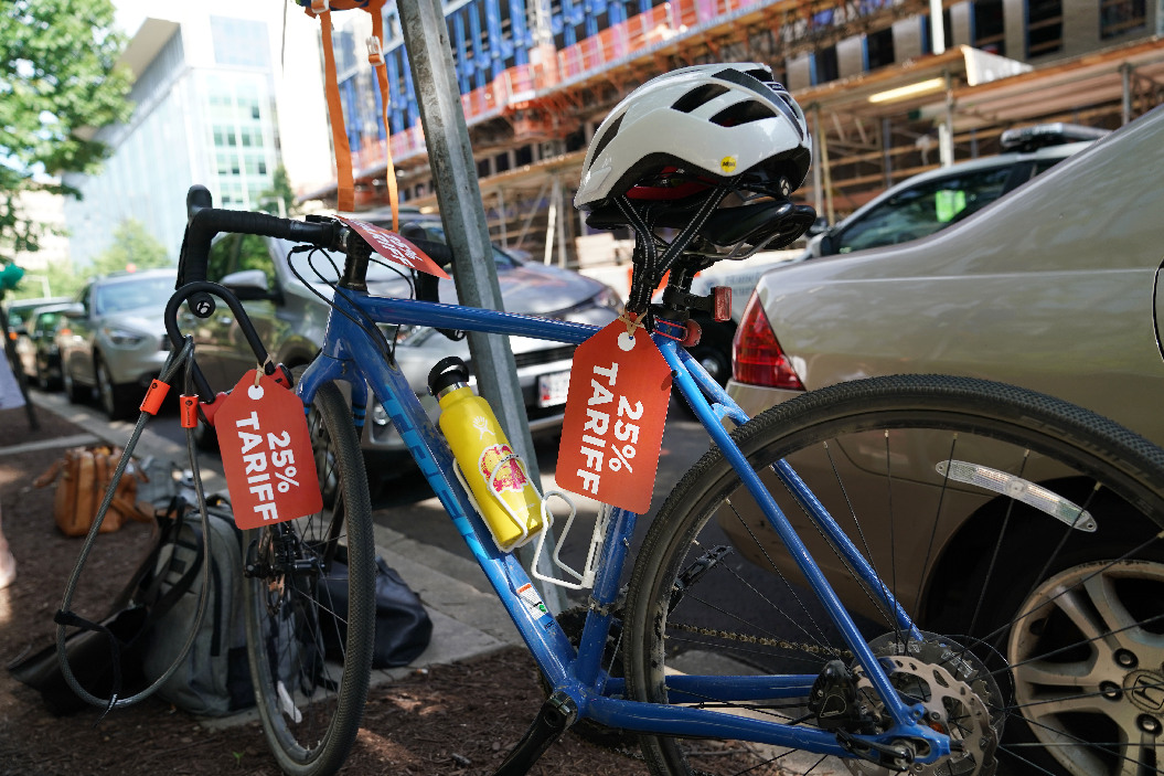 Anti-tariff posters are seen on a bike outside the building of U.S. International Trade Commission in Washington D.C., the United States, Jun. 17, 2019. (Photo/Xinhua)