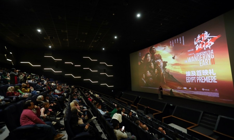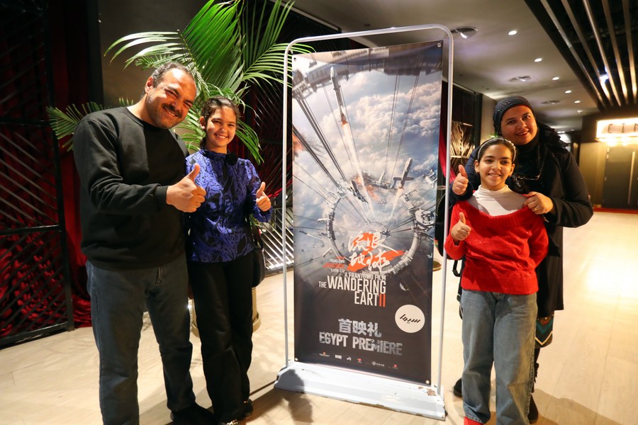 People pose for photos with a poster about the Chinese film “The Wandering Earth II” at a cinema in Giza, Egypt, on Mar. 11, 2023. (Photo/Xinhua)