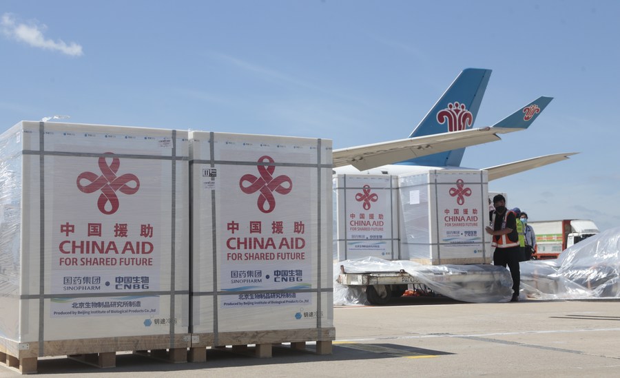 Photo taken on Aug. 1, 2021 shows packages of China’s Sinopharm COVID-19 vaccine at the Phnom Penh International Airport in Phnom Penh, Cambodia. (Photo/Xinhua)
