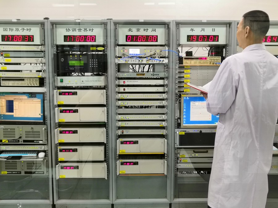 A researcher maintains the Time Reference System in the National Time Service Center of the CAS at 01:00 on Jul. 1, 2019. (Photo/Xinhua)