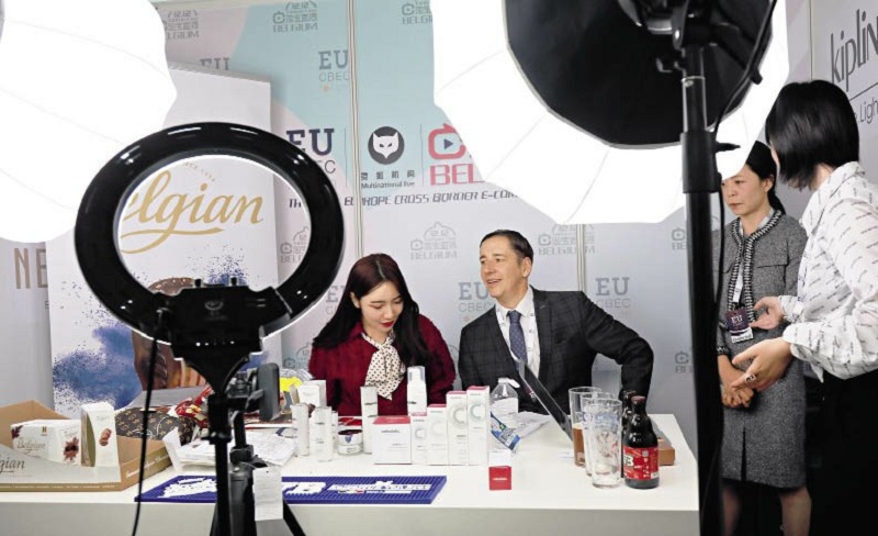 Michel Kempeneers (second left), chief operating officer of the overseas export and investment department at the Wallonia Export-Investment Agency, marketing commodities from Belgium at a live streaming at the first edition of the European Cross-Border E-Commerce Forum (EU CBEC Forum) held in the city of Liege, Belgium, on December 11, 2019.