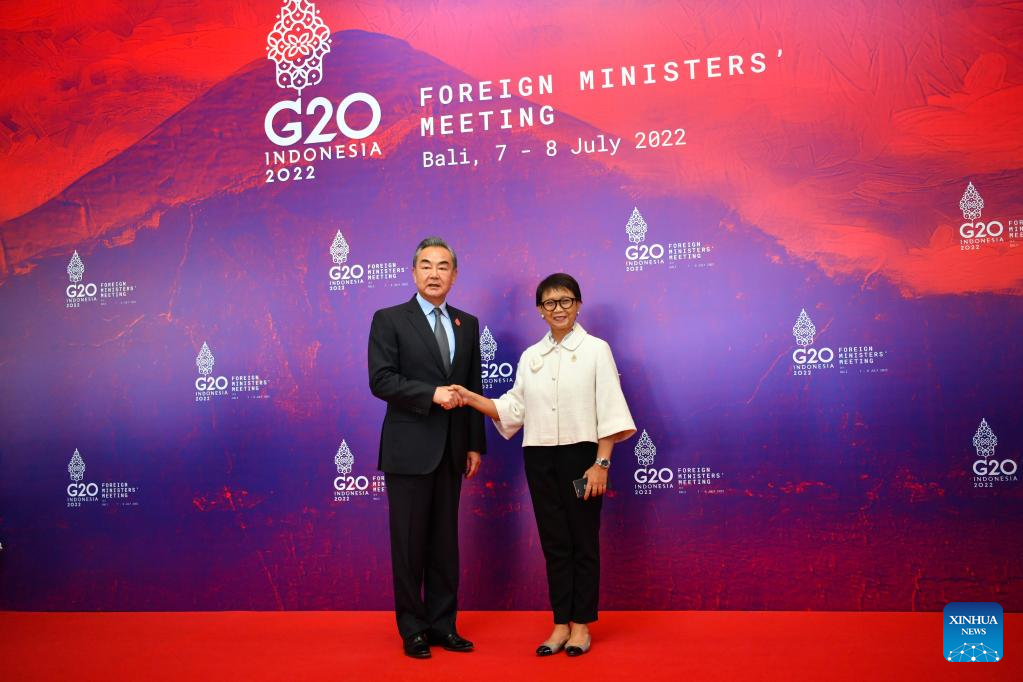 State Councilor and Foreign Minister Wang Yi attended the G20 Foreign Ministers’ Meeting in Bali on July 8, chaired by Indonesian Foreign Minister Retno Marsudi and attended by foreign ministers of member states and guest states of the G20, UN Secretary General António Guterres and responsible officials of other international organizations. This year’s meeting consisted of two sessions: a first session on?“strengthening multilateralism” and a second one on “addressing food and energy security.”