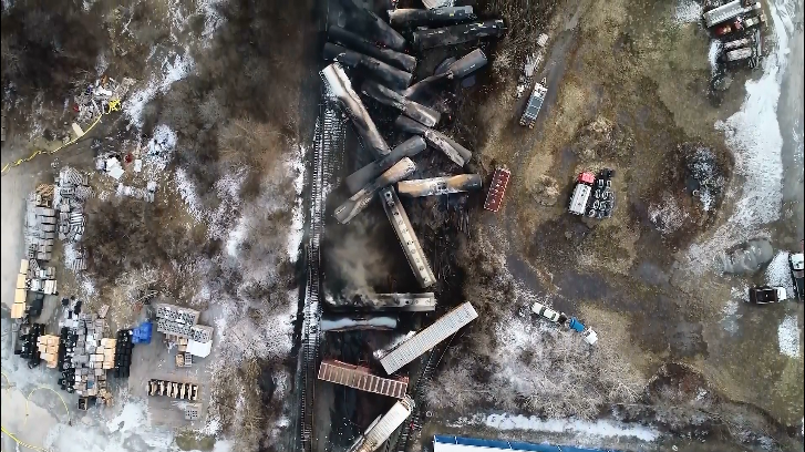 The video screenshot shows a freight train carrying hazardous chemicals derailed in the village of East Palestine, Ohio, the United States. (Photo/Xinhua)