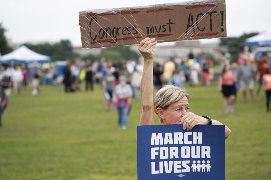 People gather during a rally decrying rising gun violence while urging politicians to take action in Washington, D.C., the United States, Jun. 11, 2022. (Photo/Xinhua)