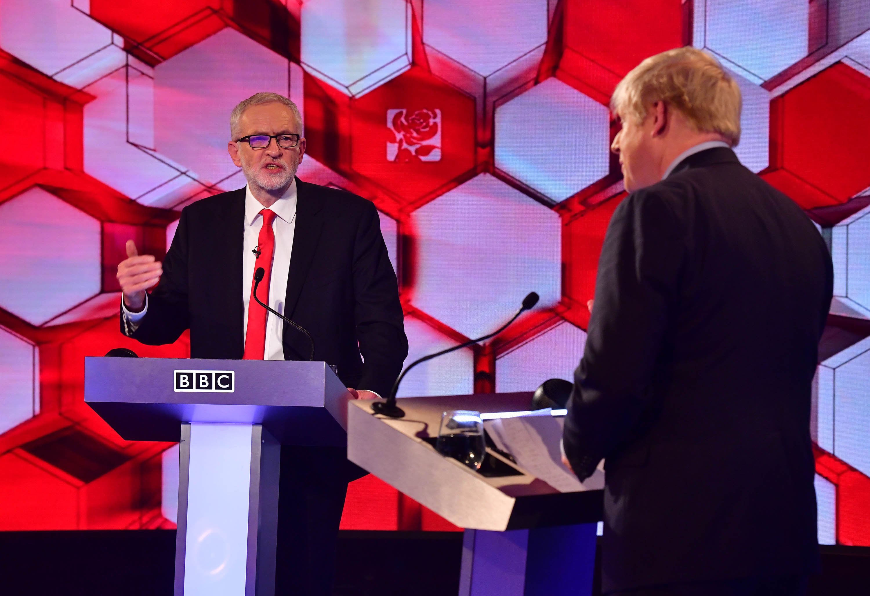British Prime Minister and Conservative Party leader Boris Johnson (R) and Labor Party leader Jeremy Corbyn take part in a debate organized by BBC in Kent, Britain, Dec. 6, 2019. (Photo/Xinhua)