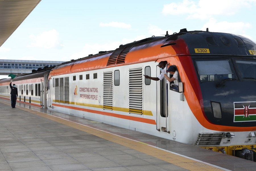 Chinese and Kenyan drivers prepare to launch the train at Nairobi station of Mombasa-Nairobi standard gauge railway (SGR) in Nairobi, capital of Kenya, Nov. 17, 2021. (Photo/Xinhua)