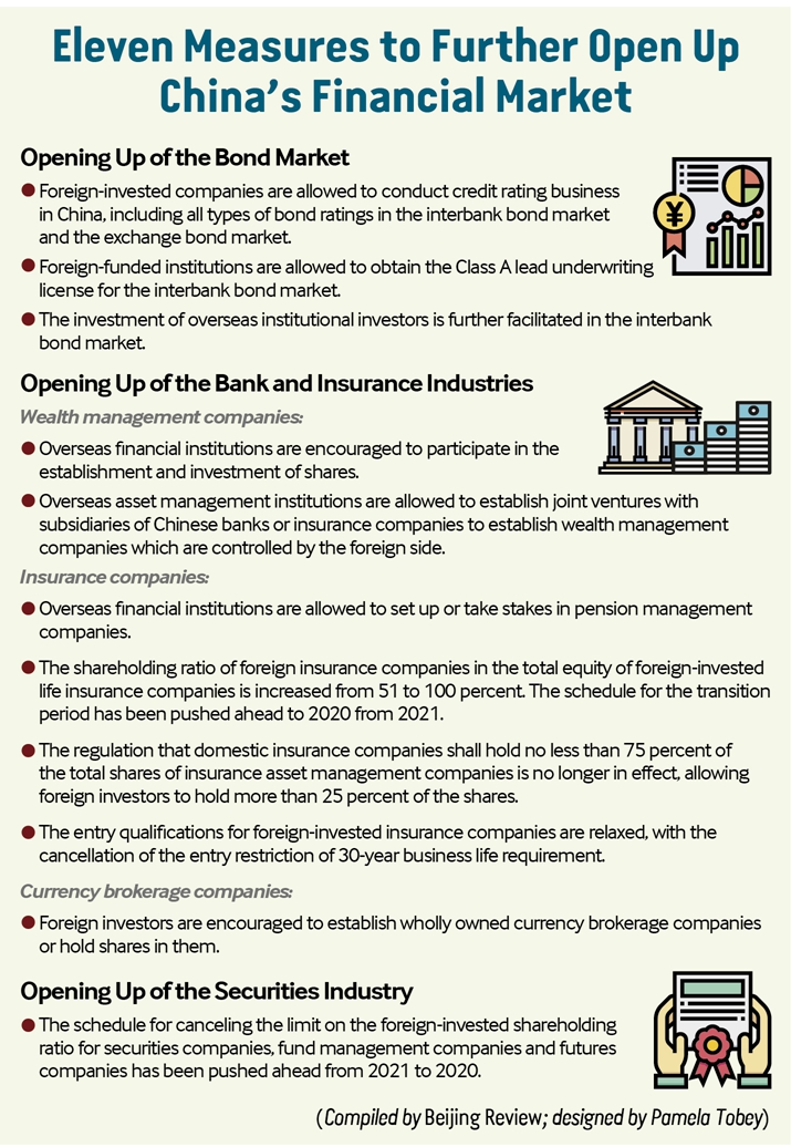 This followed the release of the Special Administrative Measures (Negative List) for Foreign Investment Access (2018) on June 28 last year, which greatly lowered the market threshold and eased restrictions on market access for foreign investment in various sectors in its 22 measures. In the finance sector, China will cancel equity caps for foreign investment in banking, as well as relax foreign equity caps to 51 percent for securities firms, fund management companies, futures firms and life insurance companies. All foreign equity caps in the finance sector will be canceled by 2021.