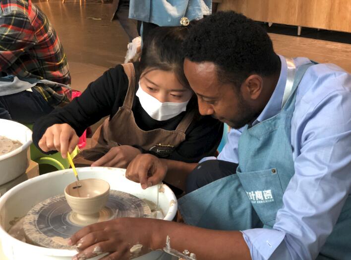An African participant of the Fifth China-Africa Youth Festival experiences pottery-making in Jingdezhen, Jiangxi Province, on Oct. 28, 2021 (Photo/Xinhua)