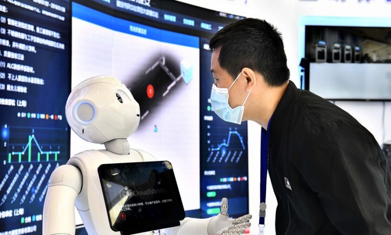 A visitor takes a picture with his mobile phone of an image designed with AI by Berlin-based digital creator Julian van Dieken (C) inspired by Johannes Vermeer’s painting “Girl with a Pearl Earring” at the Mauritshuis museum in The Hague on Mar. 9, 2023. (Photo/VCG)