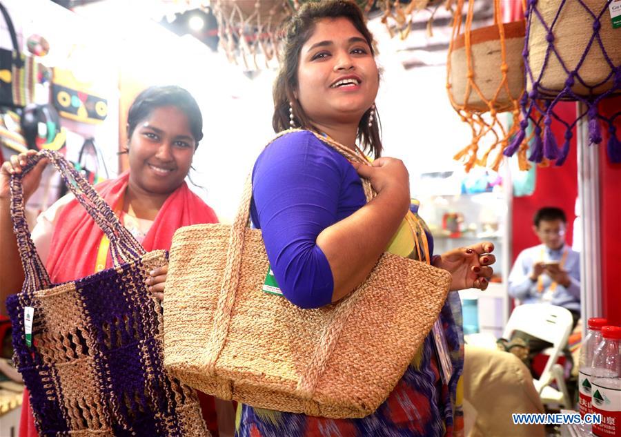 Δ?Staff members from Dada Bangla Limited present bags at the first China International Import Expo (CIIE) in Shanghai, east China, Nov. 6, 2018. More than 3,000 companies from over 130 countries and regions attended the CIIE. (Photo/Xinhua)