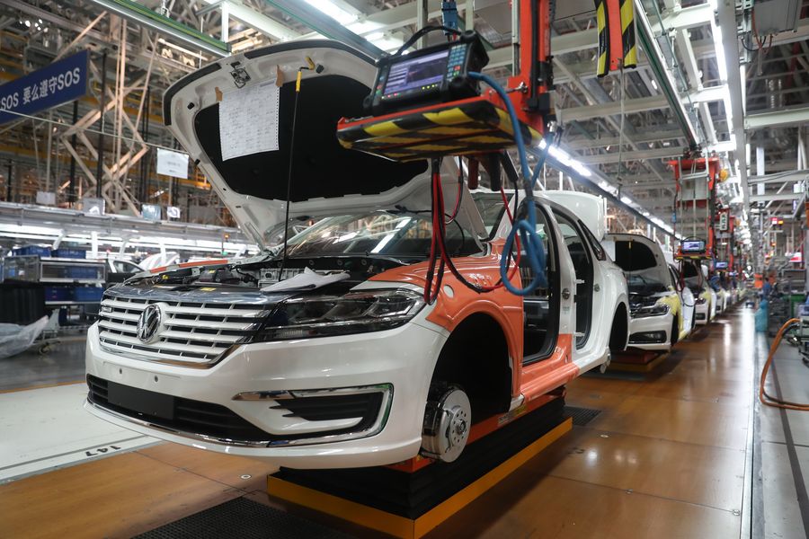 Photo taken on Oct. 29, 2019 shows new energy vehicles at a production line of SAIC Volkswagen in east China’s Shanghai. (Photo/Xinhua)
