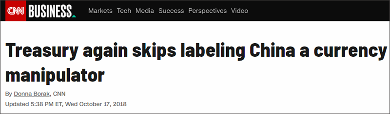 Δ An article on CNN Business on Oct. 17 shows that the US Treasury Department decided not to label China a currency manipulator despite the recent drop in the value of the yuan, once again deferring on a core 2016 campaign promise made by President Trump.