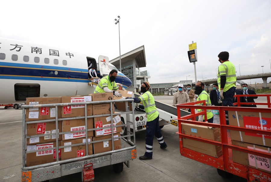 Workers unload the medical materials arrived with the Chinese medical expert team at the Islamabad International Airport in Islamabad, capital of Pakistan, March 28, 2020. (Photo/Xinhua)